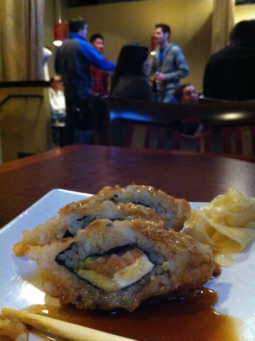 Alfonso's birthday party at Chao Bistro. The staff seemed very friendly. I think they were grateful that we brought in so much business. They're kicking off a new menu soon so they brought us experimental crab cakes. That part was good (but the picture is of a Seattle Tempura Roll). But they also tried out some experimental drinks like a "Spicy Margarita" It tasted like a saturated solution of tabasco sauce and pepper. Ugh.